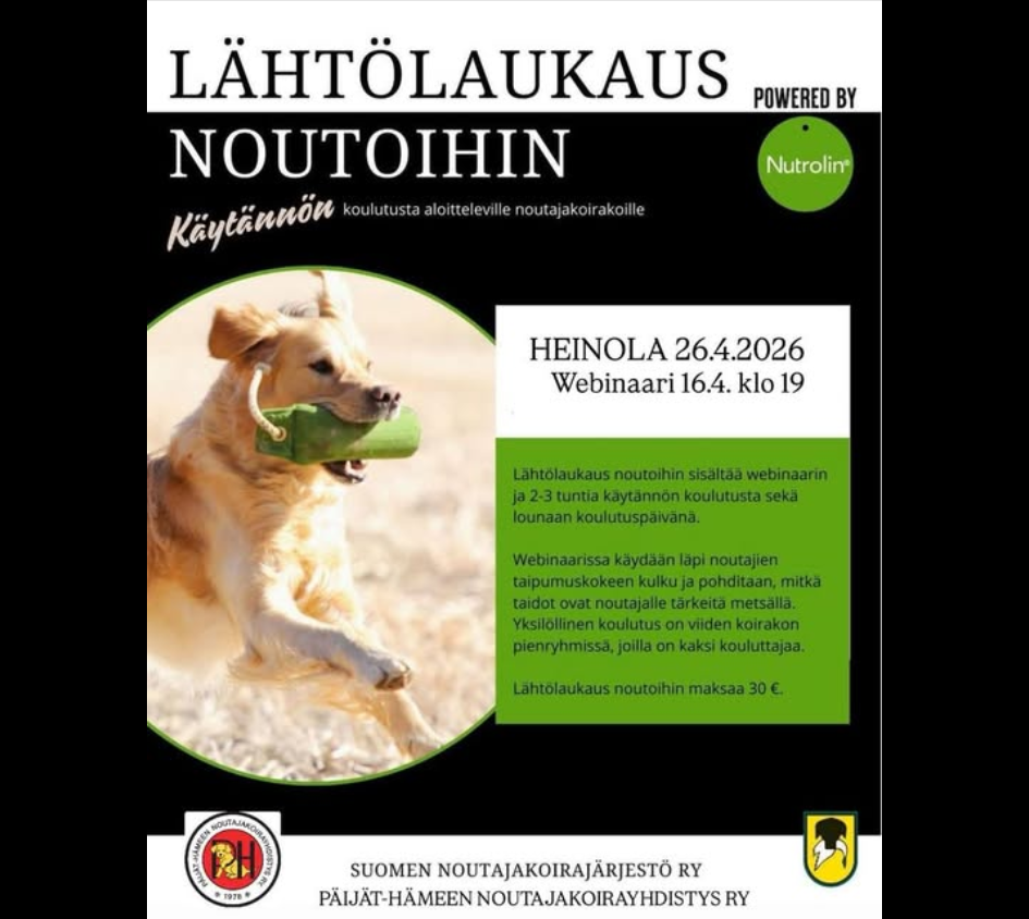 Lähtölaukaus noutoihin powered by Nutrolin® on matalan kynnyksen tapahtuma kaikille aloitteleville noutajaharrastajille, koiran tai ohjaajan ikään katsomatta. Lähtölaukauksiin kuuluu kaikille yhteinen…
