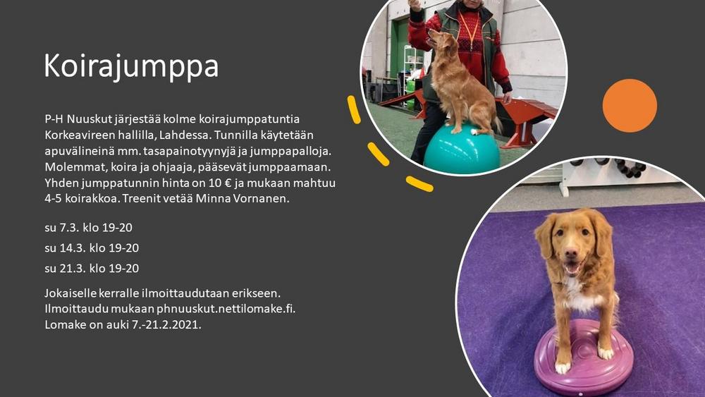 P-H Nuuskut järjestää kolme koirajumppatuntia Korkeavireen hallilla, Lahdessa. Tunnilla käytetään apuvälineinä mm. tasapainotyynyjä ja jumppapalloja. Molemmat, koira ja ohjaaja, pääsevät jumppaamaan. Yhden jumppatunnin hinta on 10 € ja mukaan mahtuu 4-5 koirakkoa. Treenit vetää Minna Vornanen.