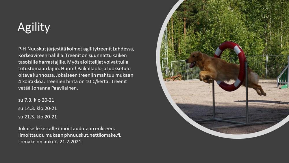 P-H Nuuskut järjestää kolmet agilitytreenit Lahdessa, Korkeavireen hallilla. Treenit on suunnattu kaiken tasoisille harrastajille. Myös aloittelijat voivat tulla tutustumaan lajiin. Huom! Paikallaolo ja luoksetulo oltava kunnossa. Jokaiseen treeniin mahtuu mukaan 4 koirakkoa. Treenien hinta on 10 €/kerta. Treenit vetää Johanna Paavilainen.