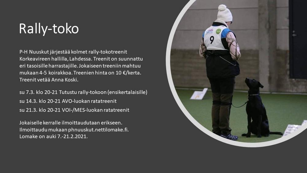 P-H Nuuskut järjestää kolmet rally-tokotreenit Korkeavireen hallilla, Lahdessa. Treenit on suunnattu eri tasoisille harrastajille. Jokaiseen treeniin mahtuu mukaan 4-5 koirakkoa. Treenien hinta on 10 €/kerta. Treenit vetää Anna Koski.
